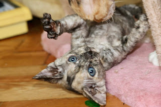 The kittens are now approaching 9 and 7 weeks and they are nutters! They have two speeds, full throttle and asleep. Unfortunately, due to potential owner not being entirely honest with me, Pollys blue tabby and white girl is re available. She is such an affectionate and playful girl. I also have 3 kittens available from Bernards litter, the red/white boy, the dark torti girl and the blue tabby girl. Please contact me if you would like further information on any of these.